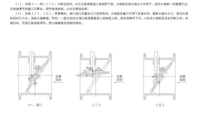 當(dāng)水泵啟動(dòng)后進(jìn)口端水經(jīng)過、過渡器、截止閥、高壓管、進(jìn)入膜片缸下部,在水的壓力下推動(dòng)膜片關(guān)上行帶小閥板緩慢開啟,大閥板在水力的推動(dòng)下與小閥板同時(shí)開啟,完成開閥。